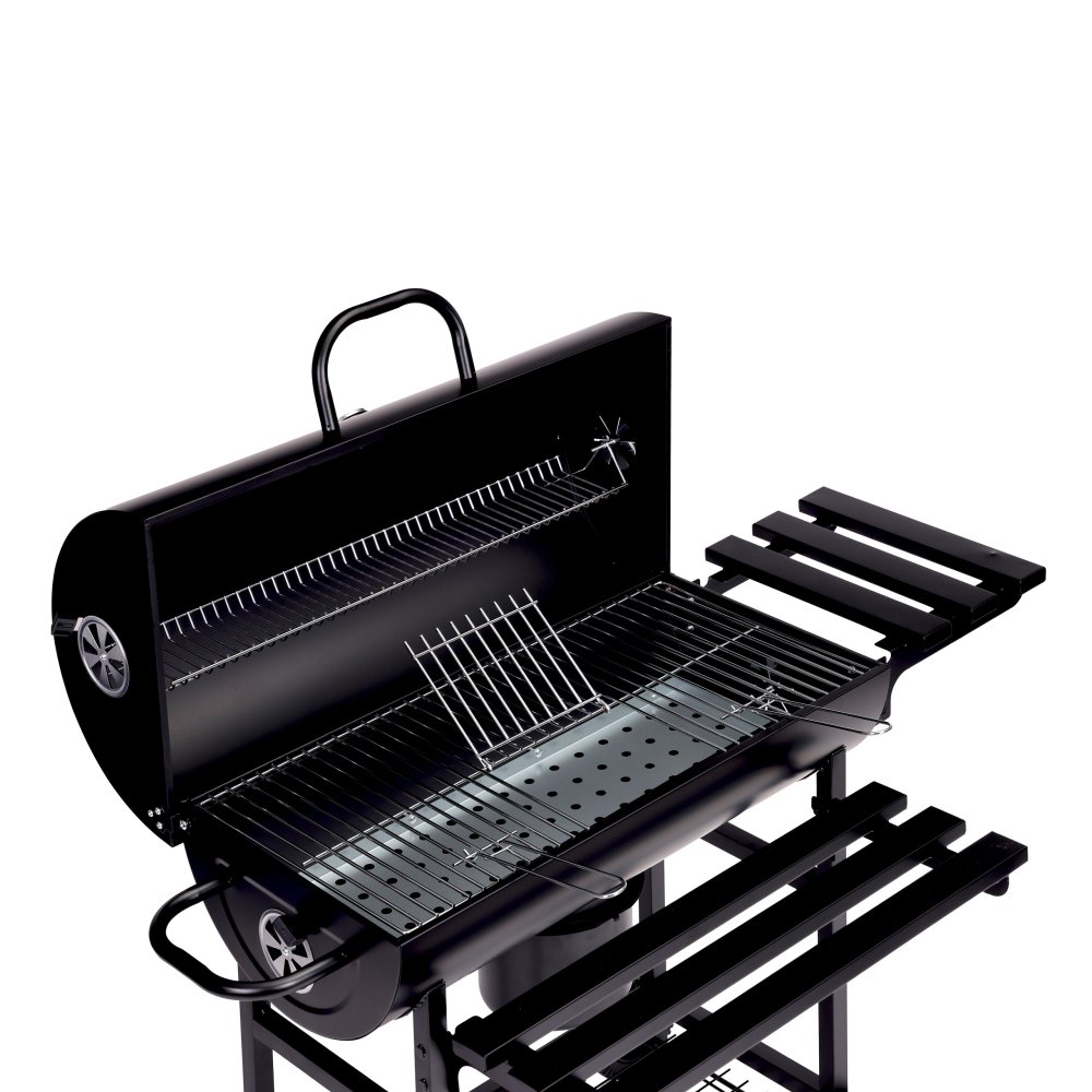 The large 70x35 cm chrome-plated grate provides ample cooking space for multiple people. Thanks to the lifting handles, you can easily add charcoal without removing the entire cooking surface. An additional 67x10 cm warming rack keeps your finished dishes hot without burning them. Two practical folding shelves (64x22 cm and 36x22.5 cm) offer convenient space for your BBQ accessories, spices, and plates.