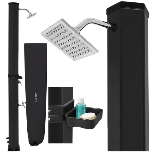 The complete set includes the Gardlov solar shower, mounting hardware, a hose adapter, a protective cover, a soap/shampoo holder, and an instruction manual. Everything you need for a quick and easy setup is right in the box.
