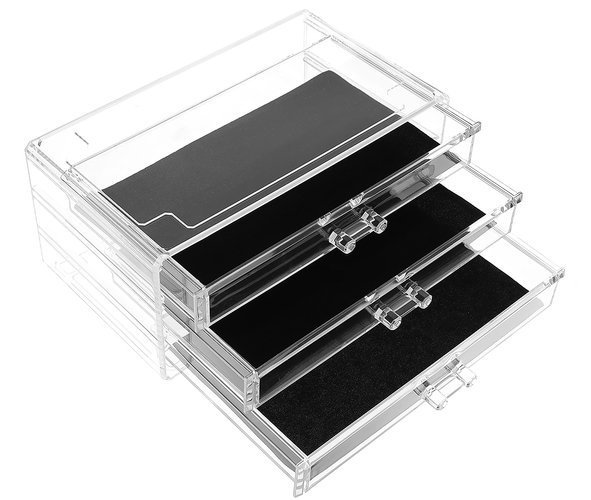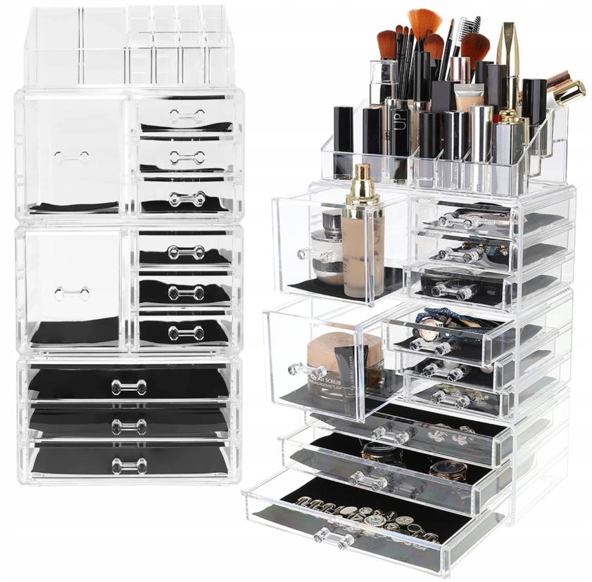 The organizer consists of 6 small drawers for small cosmetics such as eyeshadows, powders, bronzers and small jewelry, 2 large drawers for cosmetics such as creams, 3 oblong drawers for watches or bracelets, 12 compartments for lipstick, nail polishing, 2 compartments for brushes, 1 smaller for small accessories and one large for foundation, perfumes, etc.