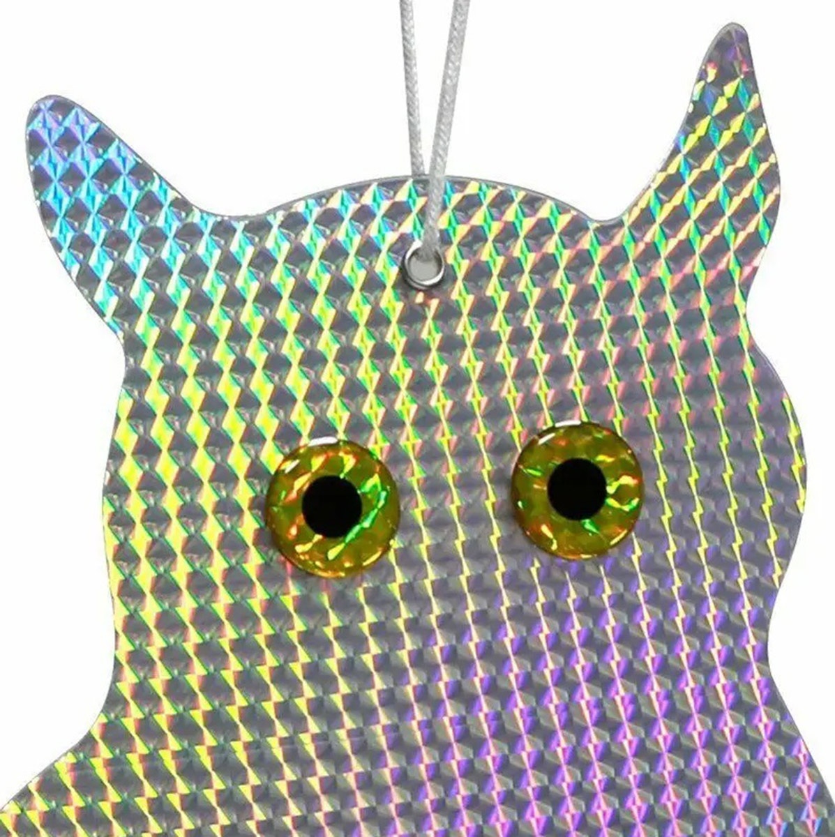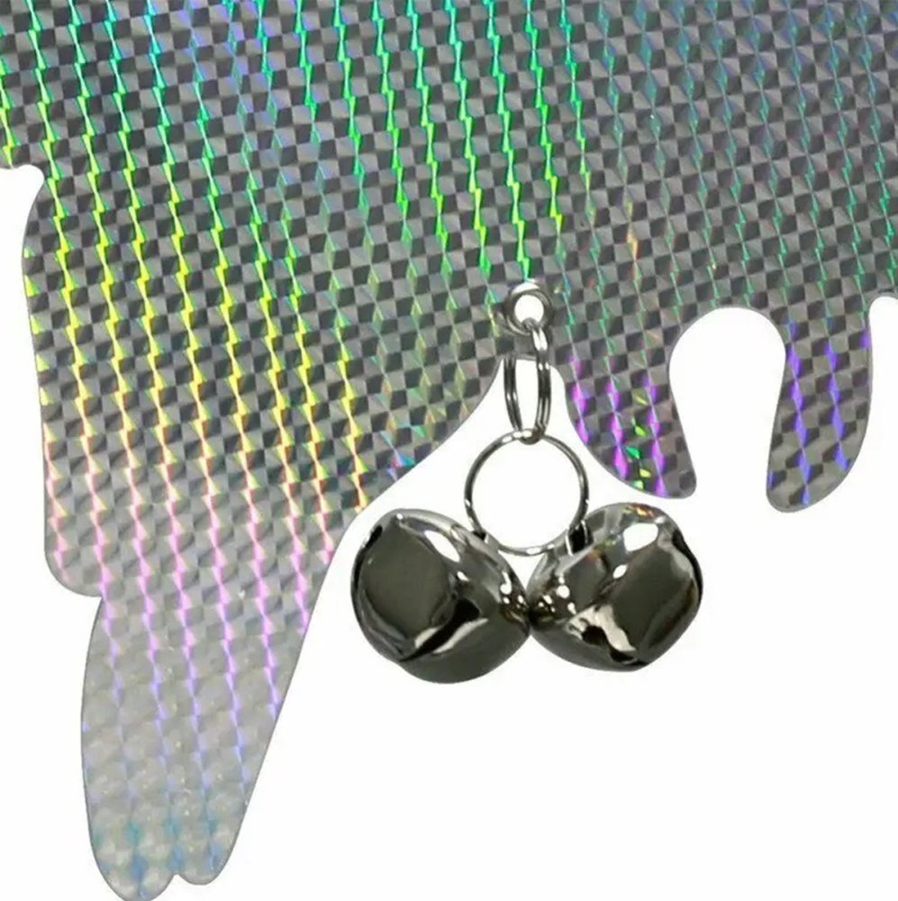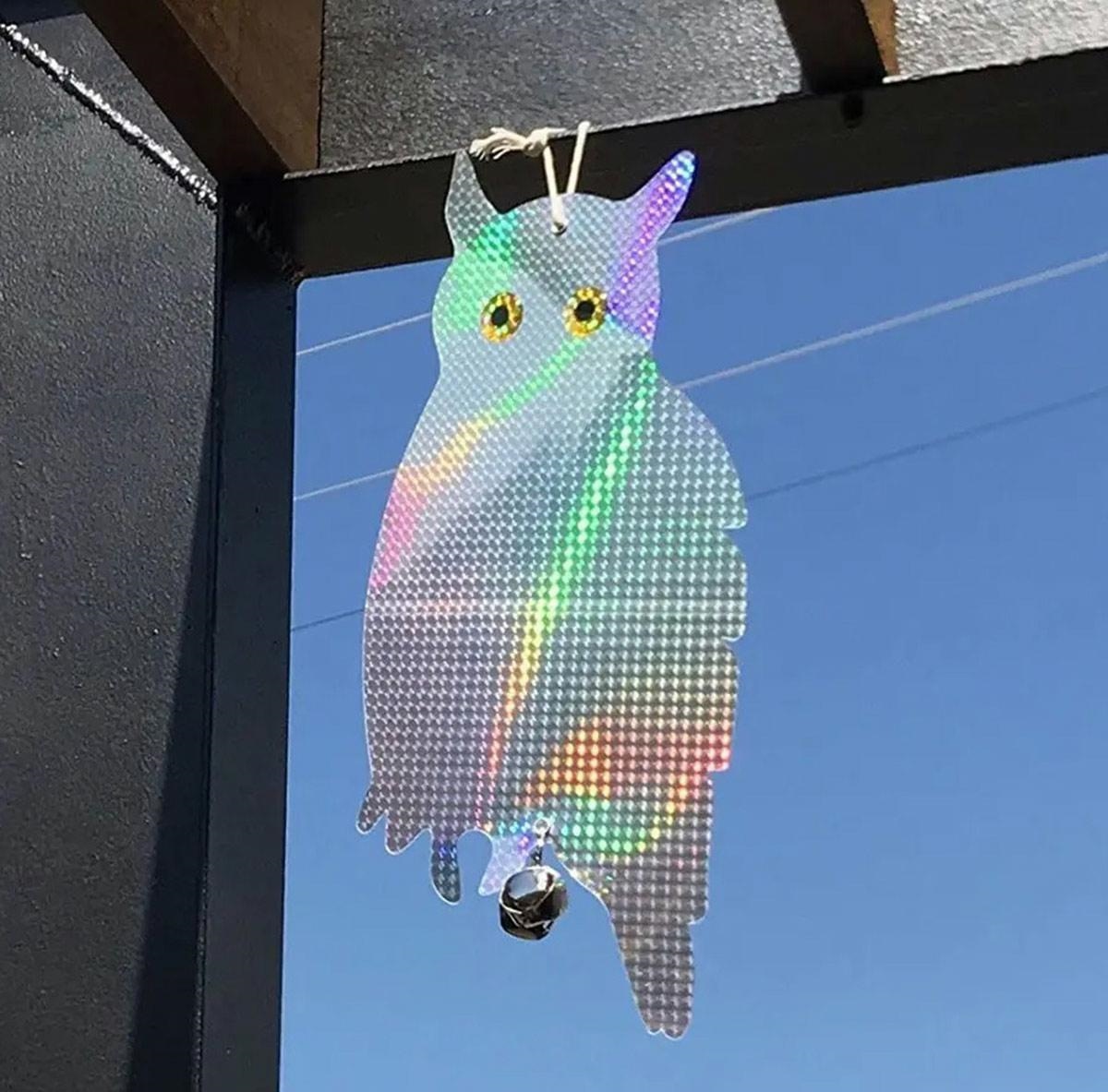 Effective bird repeller shaped like a sitting owl, featuring a holographic coating for a realistic 3D effect that deters unwanted birds. Equipped with two bells at the bottom to enhance the repelling effect. Easy to hang using the dedicated string at the top. Ideal for protecting gardens and crops.