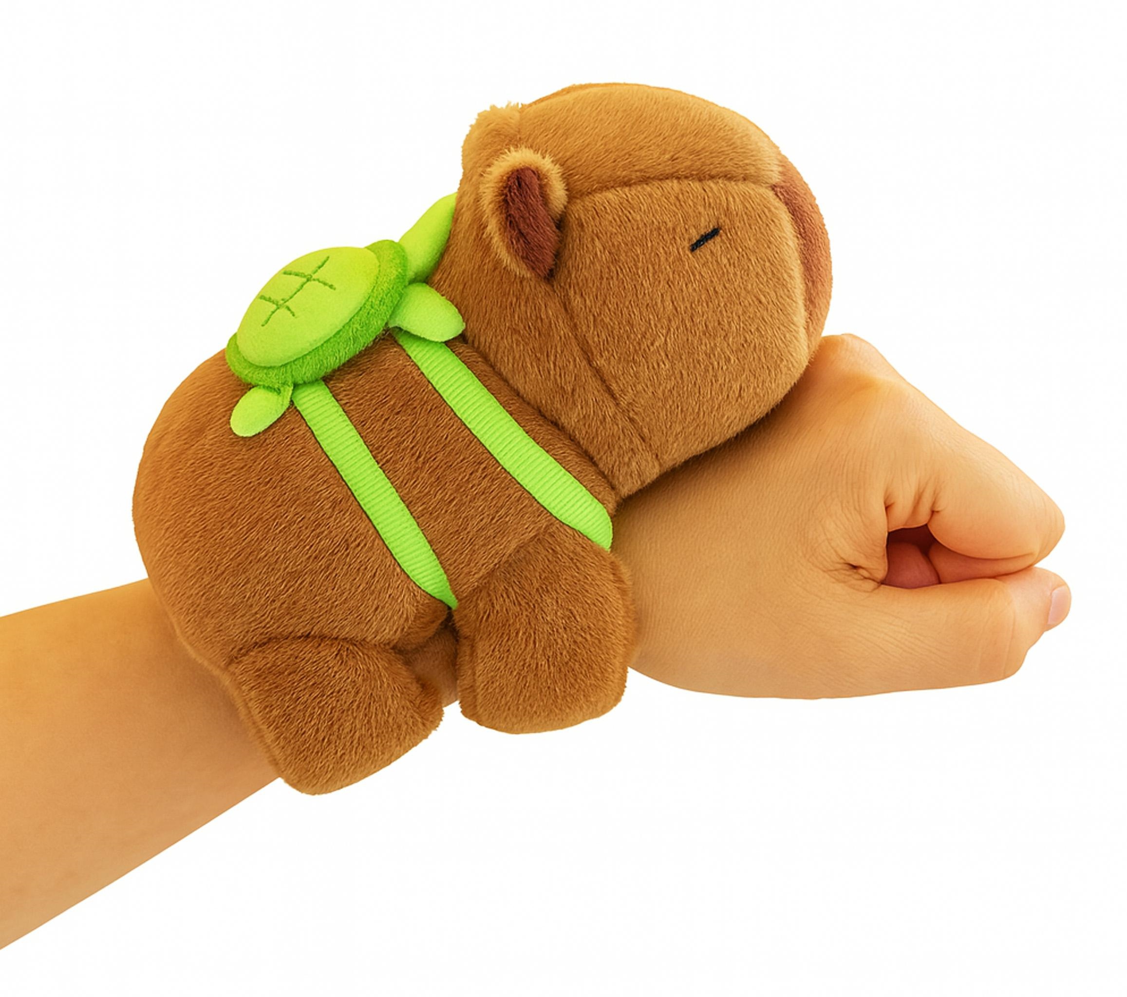 Meet your new best friend! This adorable capybara plush slap bracelet wraps around your wrist for a hug, featuring a cute turtle backpack. The perfect fun accessory for kids.