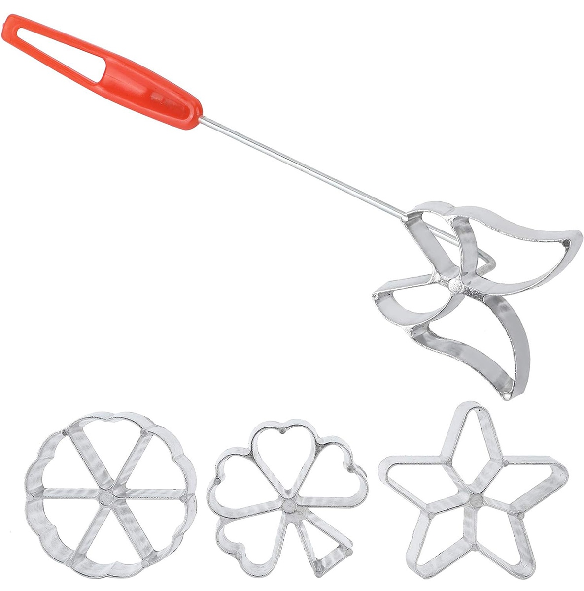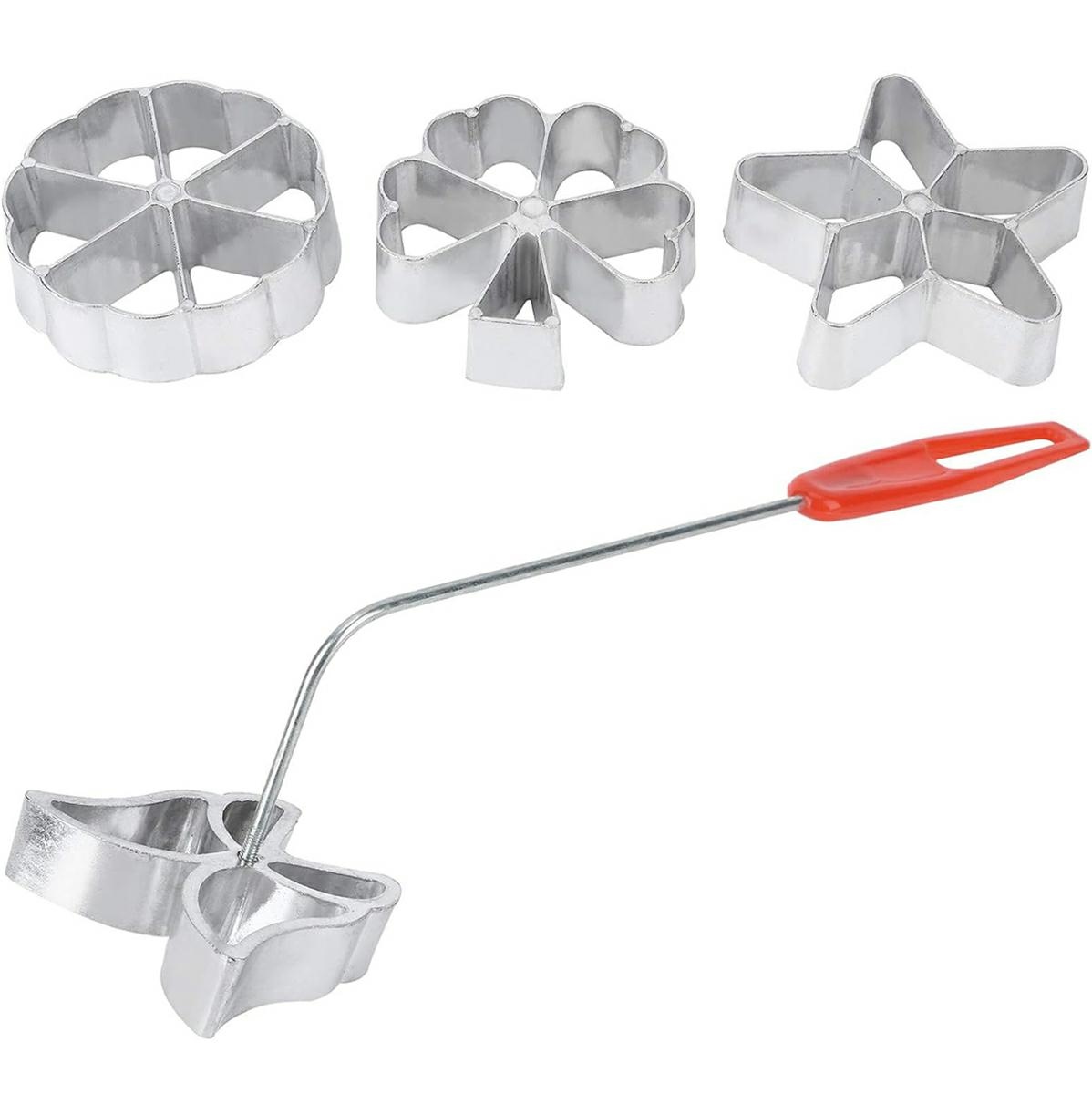 Aluminum molds for pancake batter and waffles. Set includes 4 pieces of different shapes. Perfect molding cakes thanks to its aluminum construction. It is extremely easy keep clean does not absorb odors. The set equipped with a long comfortable handle.