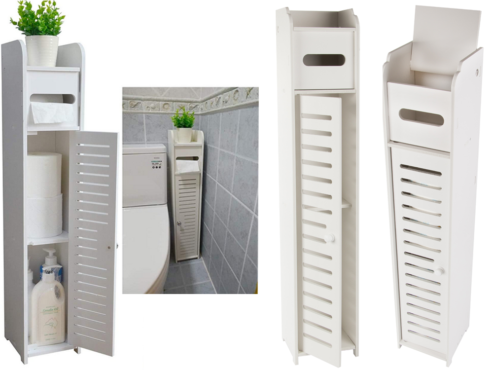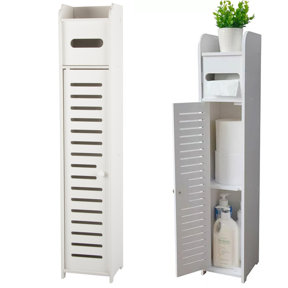 The narrow cabinet contains enough space to store cosmetics, toilet paper and other small items.