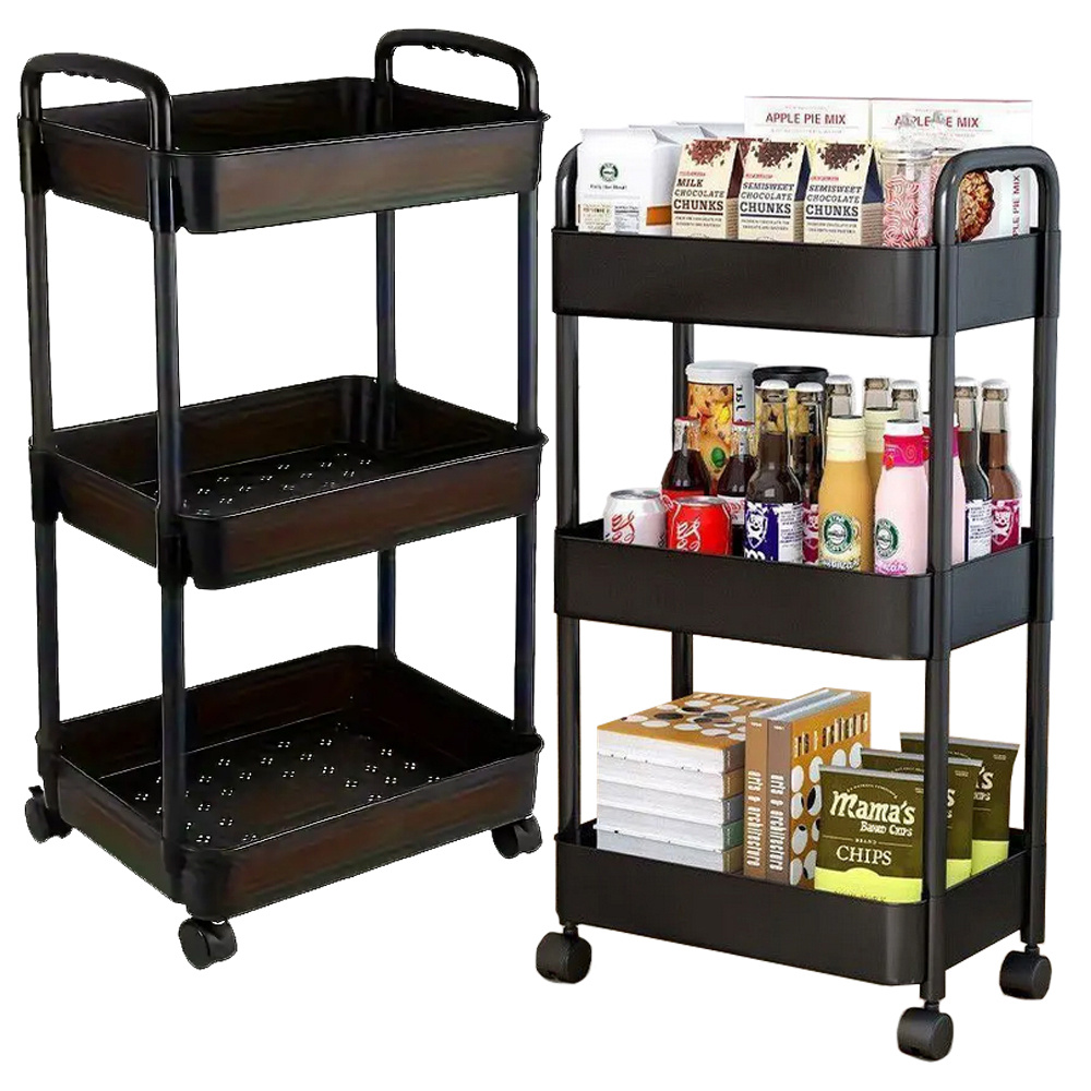 Three Level Storage Trolley on Wheels, Rolling Cart Organizer Shelf, Black