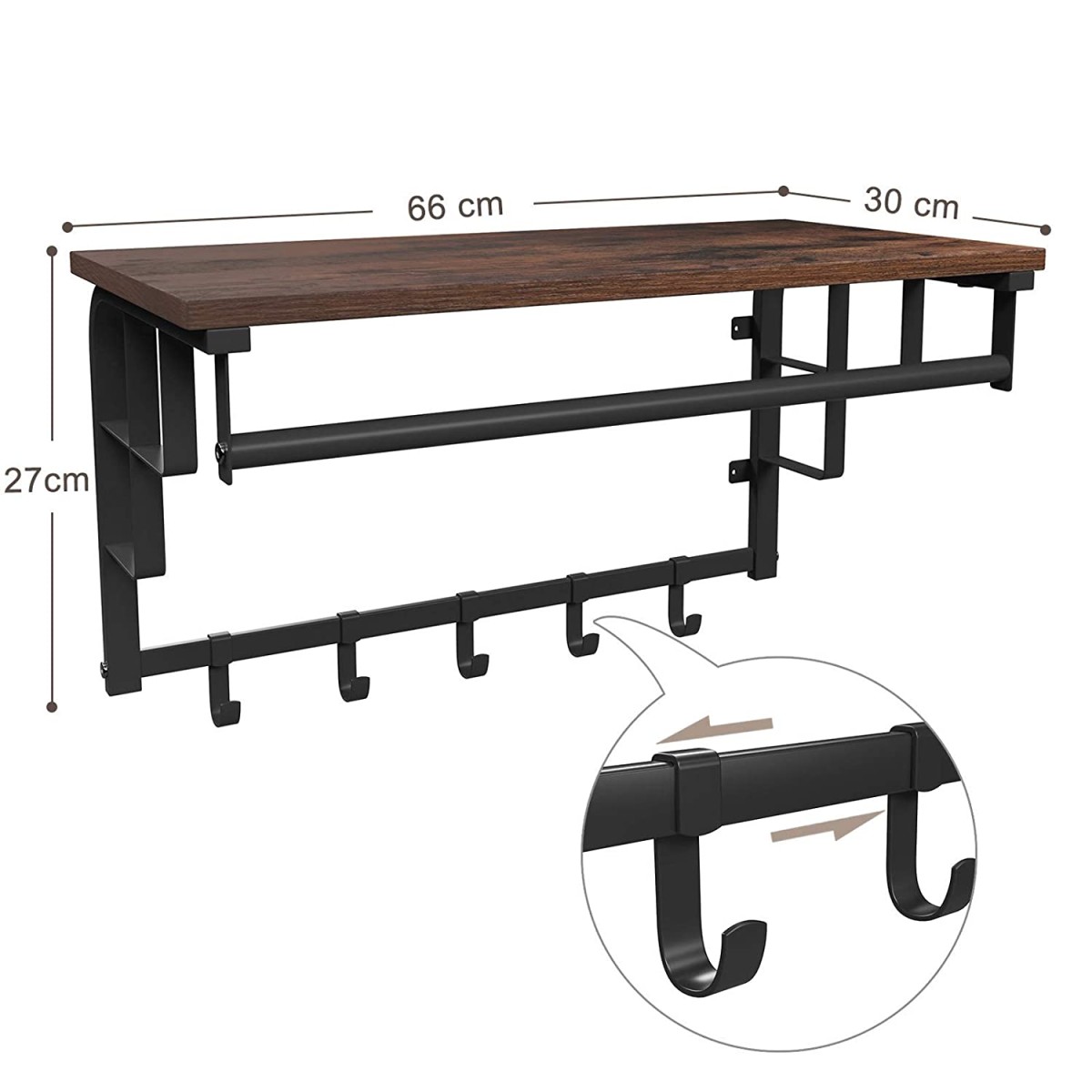 Organize your entryway with our industrial wall mounted coat rack. Featuring a sturdy shelf, 5 hooks, and a hanging rail, it's the perfect solution for coats, bags, and decor.