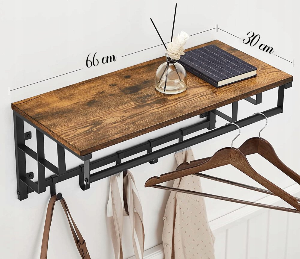 The rack is 66cm wide, 30cm deep, and 28cm high (32cm with hooks).
