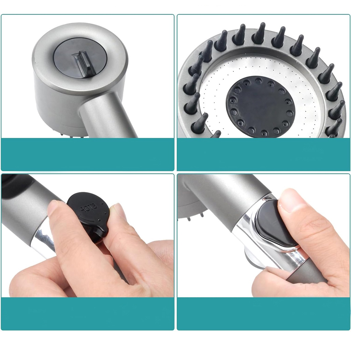 Shower handset in gray color. Designed to be installed a standard shower hose. The has classic function and STOP stopping the stream. An additional advantage is ability adjust strength of stream using knob on back.