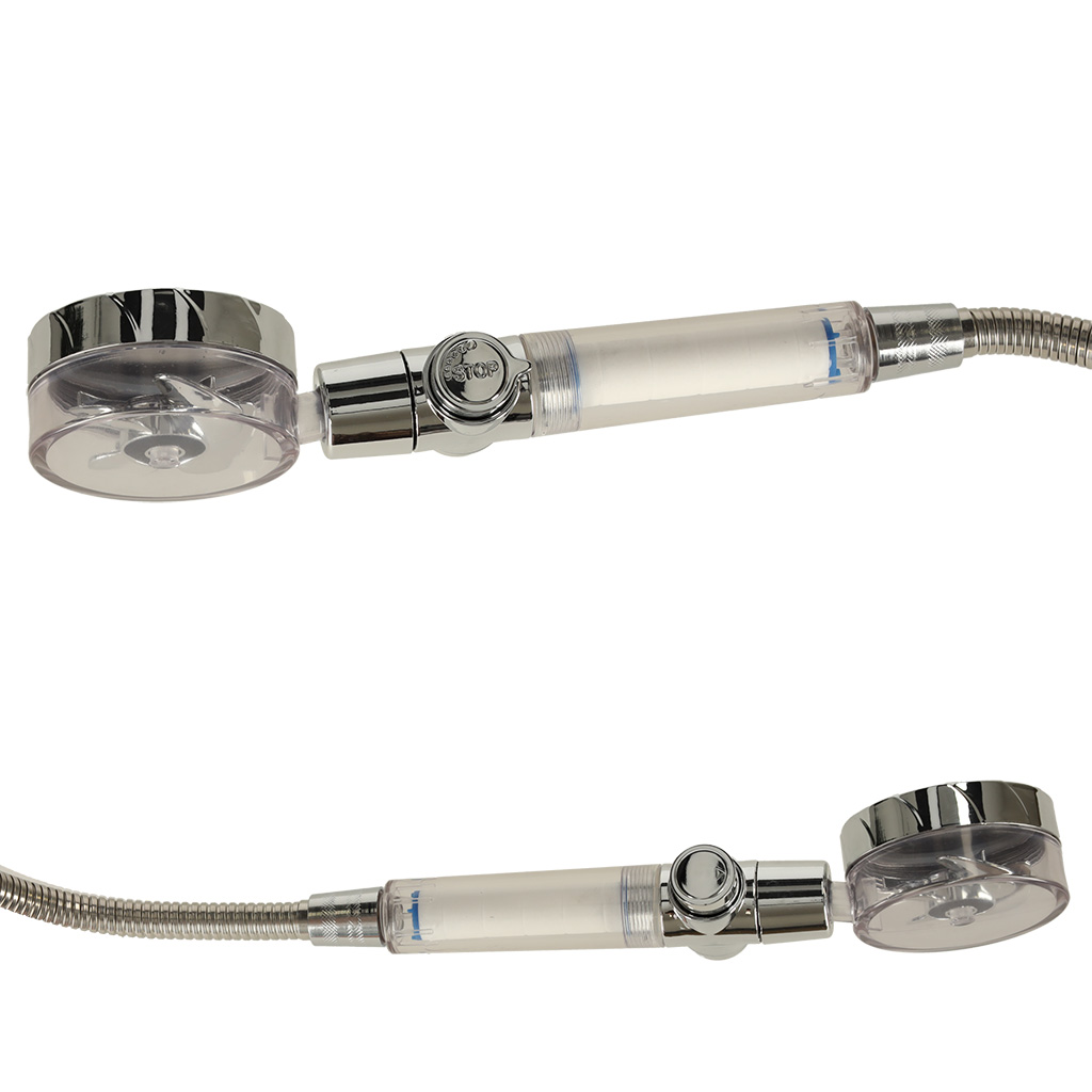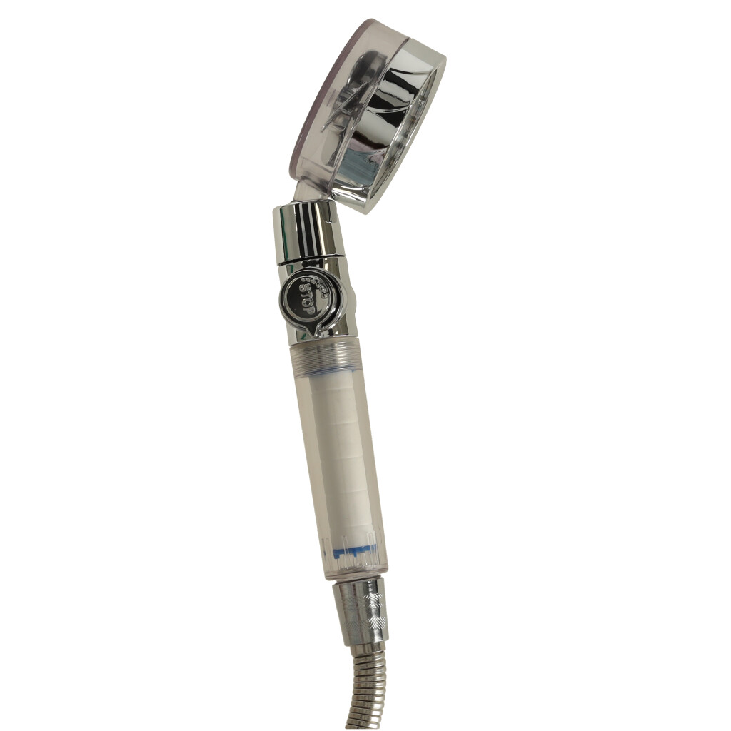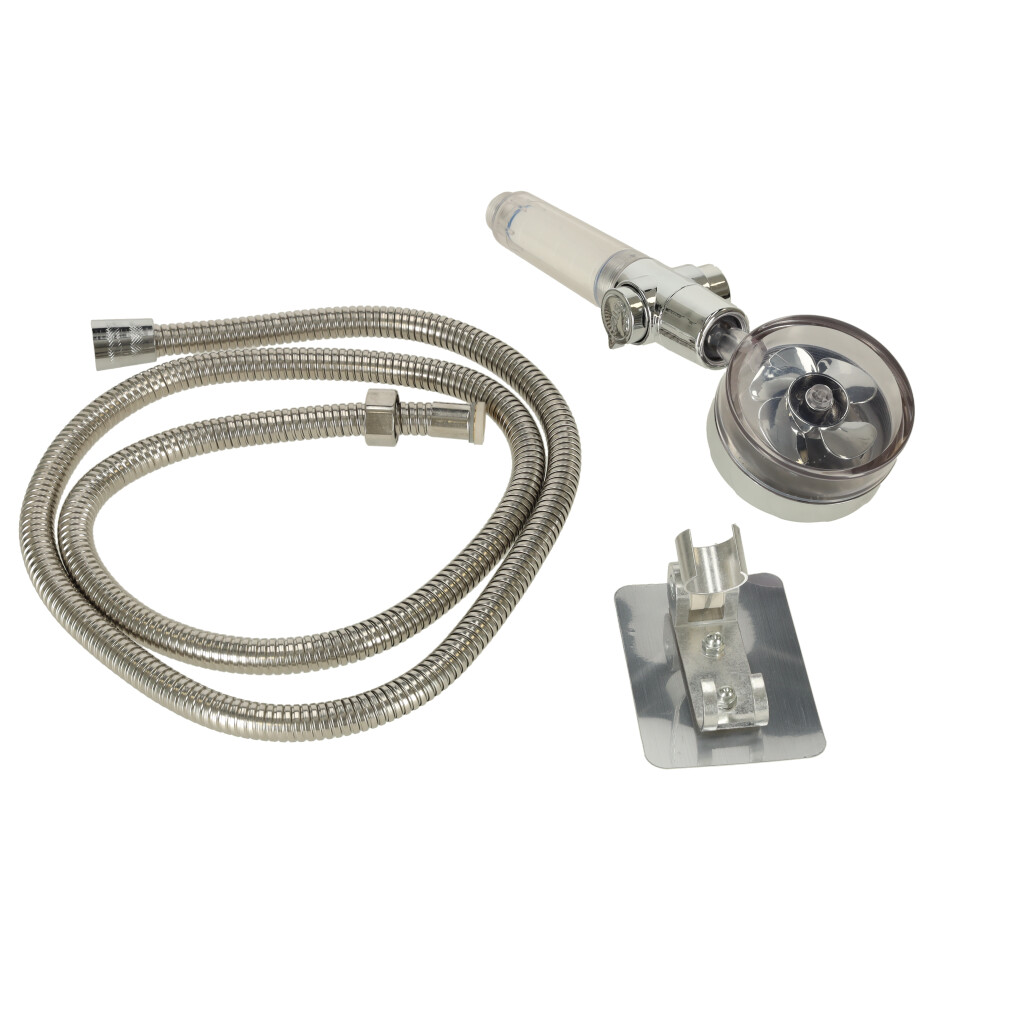 Silver water-saving shower head with filter and hose provides a comfortable shower while helping to protect your skin and hair. The built-in filter softens water and reduces limescale, while the included hose and holder make daily use even more convenient.