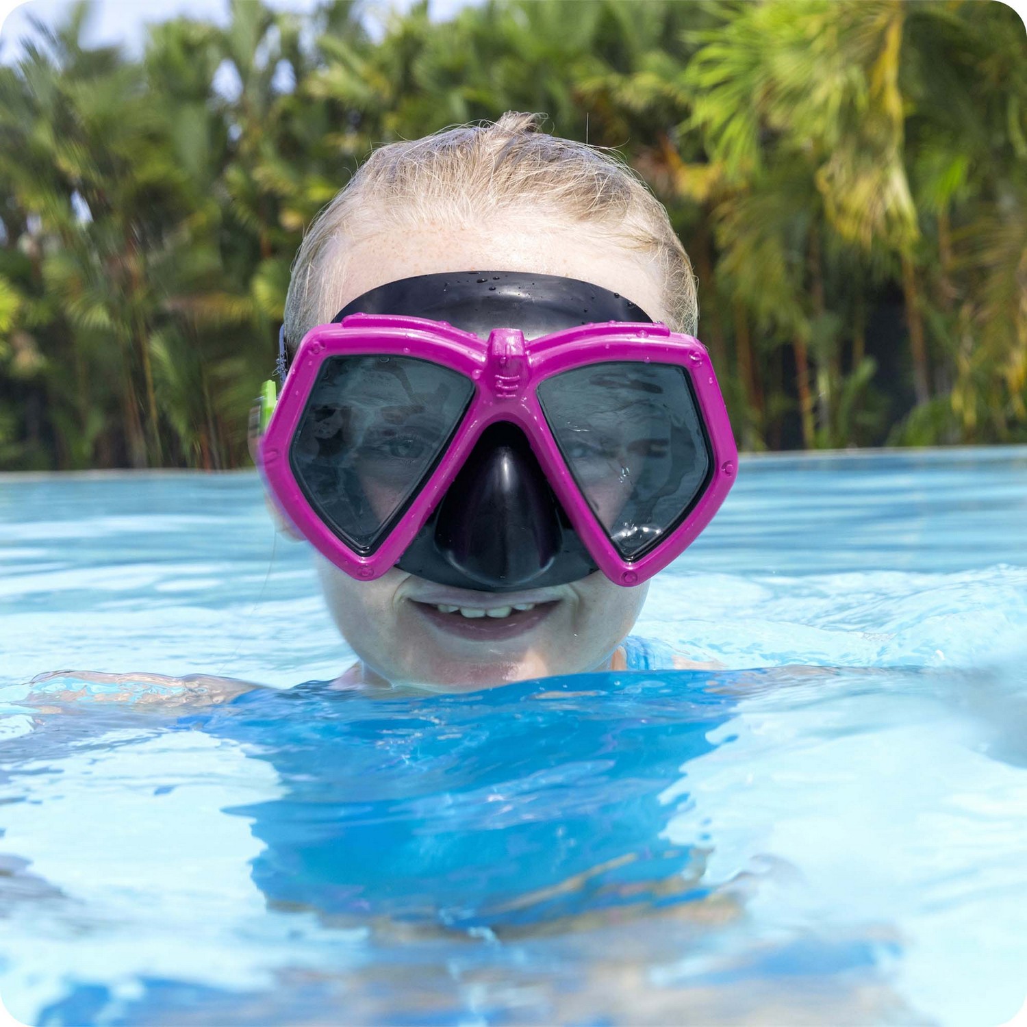 Now you can dive and enjoy water activities to the fullest! The swimming mask features polycarbonate lenses, providing a wide field of view so you won't miss any underwater wonders. It also fits perfectly to the shape of your face, preventing water from leaking in. The adjustable strap keeps the mask securely in place.