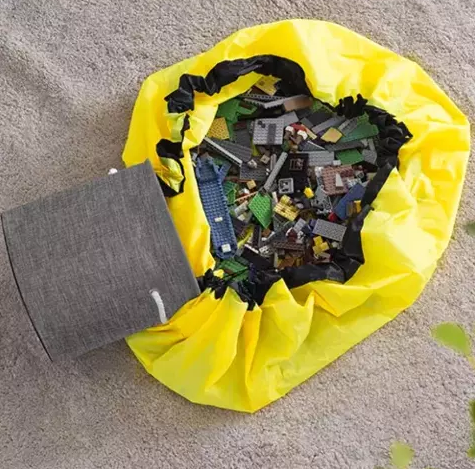2 in 1 - the product has two functions. It's a brilliant solution for storing and quickly cleaning up blocks and toys. Except that the mat is also used for fun. It is large, 135 cm in diameter, and is connected to the basket with a long Velcro. Which makes pouring and collecting toys much easier. In addition, the mat has a sewn string with a stopper that turns it into a sack when removed.