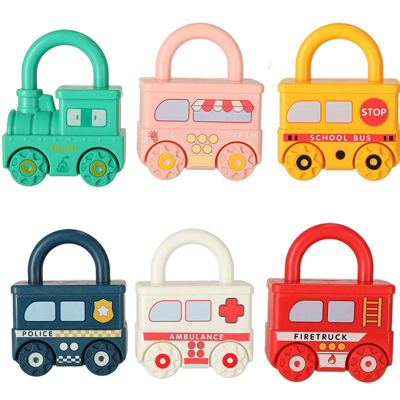 This educational toy perfectly blends fun and learning. The set includes six charming vehicles: a locomotive, school bus, police car, fire engine, ambulance, and an ice cream truck. Each vehicle is a different colour and functions as a lock, encouraging your child to find the correct key to open it.