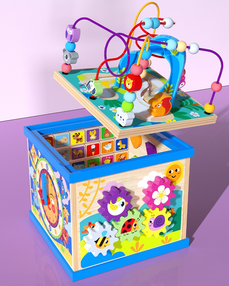 Discover the perfect toy for your little one's early development with our wooden activity cube Jhtoy-423. This multi-functional educational center combines a shape sorter, bead maze, and more to provide hours of engaging and educational fun.