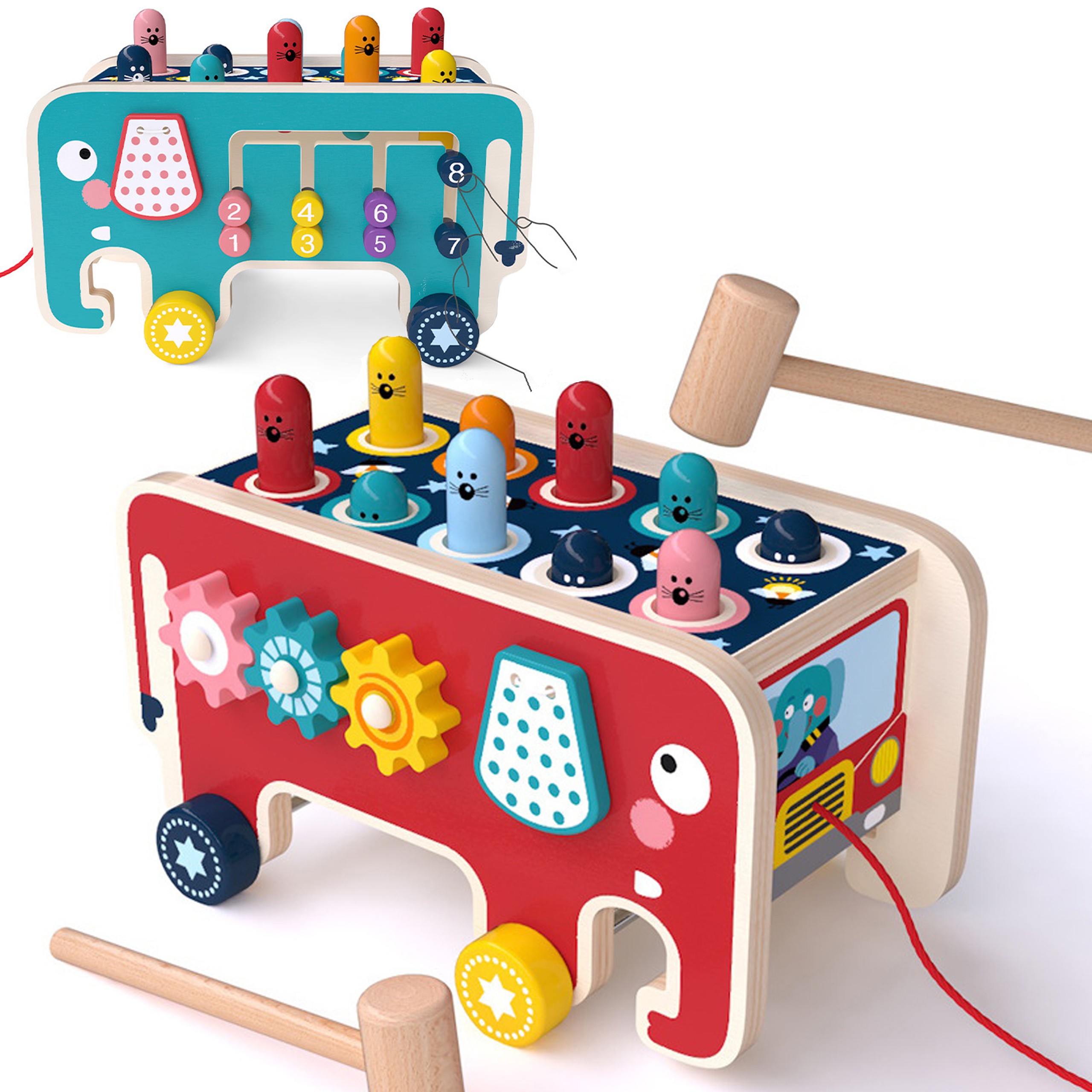 Introduce your toddler to the joy of learning with this charming wooden hammering toy. Featuring a delightful elephant driving a bus, this toy is a fantastic way to develop your child's hand-eye coordination and fine motor skills while providing hours of fun.