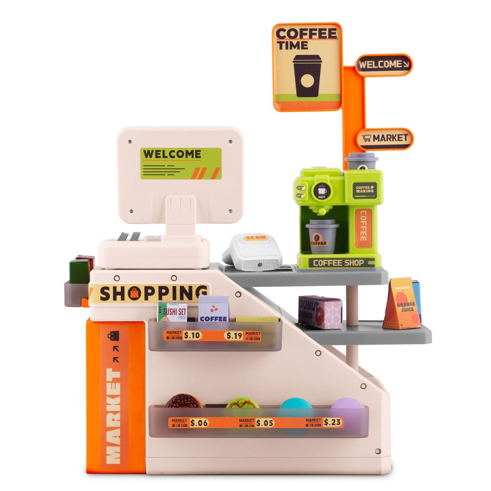 Vibrant colors stimulate your child's vision, while features like the cash register with a screen, barcode scanner, coffee machine, fridge, and a variety of products with play money will keep them engaged for hours.