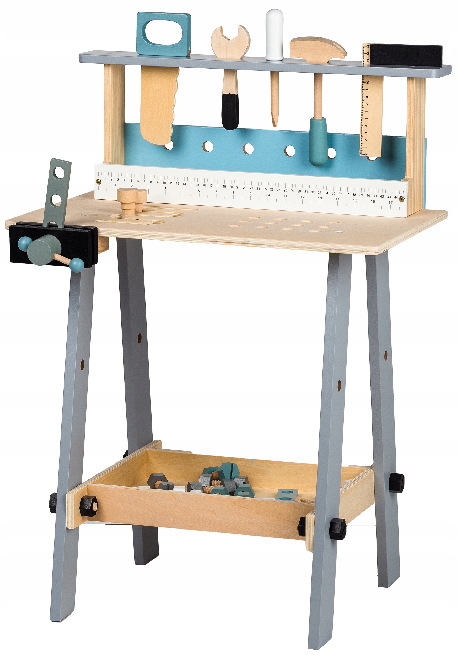 Every child loves to imitate adult behaviour, and while real tools are off-limits, this toy workbench provides the perfect solution. It allows your little one to safely learn about basic tools through engaging and creative play. The set includes 32 different construction elements that can be combined in countless ways. Kids can hammer wooden nails into the tabletop or even use the built-in toy vise.