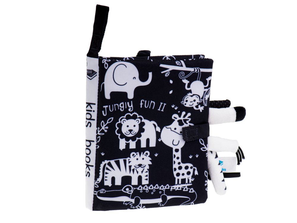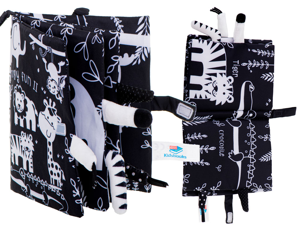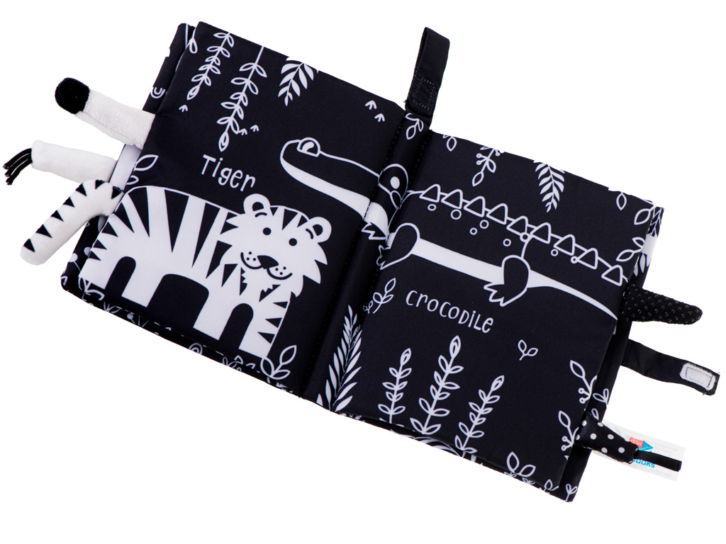 A magic book made of fabric with contrasting patterns is a great gift for children who are just getting to know the world. The book consists of 4 fabric pages with images of various animals, among which you will find: giraffe, lion, elephant, monkey, tiger and crocodile.