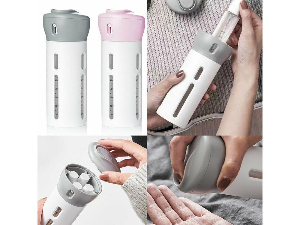 Practical travel organizer for cosmetics with a built-in liquid dispenser, perfect for saving space in your luggage. Designed for storing and dispensing essential liquid toiletries like shampoo, shower gel, or face cream.