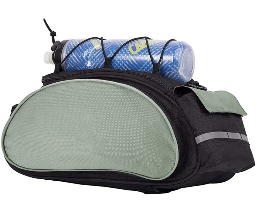 Spacious bike bag with four compartments, designed for mounting on the rear rack. Made from durable, easy-to-clean, waterproof polyester. Perfect for both short and long cycling trips. Features a roomy 15-liter main compartment, two side zip pockets, and a rear pocket with Velcro closure. Includes an extra bottle holder. Reflective elements enhance safety and visibility after dark. The bag attaches easily with Velcro straps and can also be used as a shoulder or hand bag thanks to the included strap and handle.