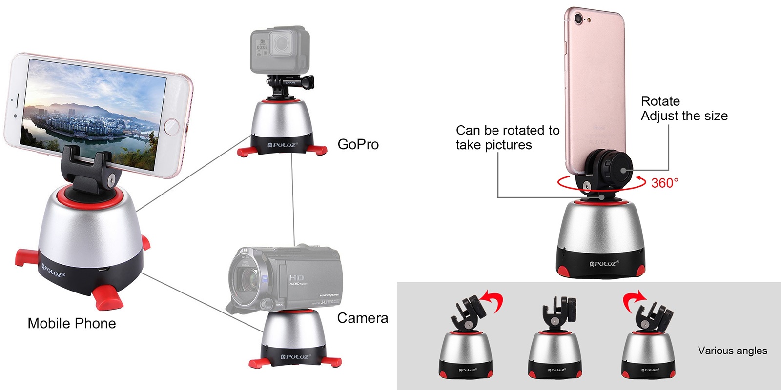 The 360-degree rotation panoramic head is the perfect solution for creating panoramic photos and videos. Designed for various recording devices (phones, tablets, video cameras, sports cameras). Set includes smartphone holder, additional action camera holder and remote control.
