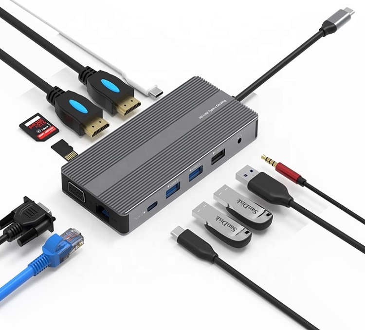 Adapter Usb Type-C - 2X Hdmi, Vga, Lan, 3X Usb Type-A, Sd, Tf, Usb Type-C Pd100W, Aux