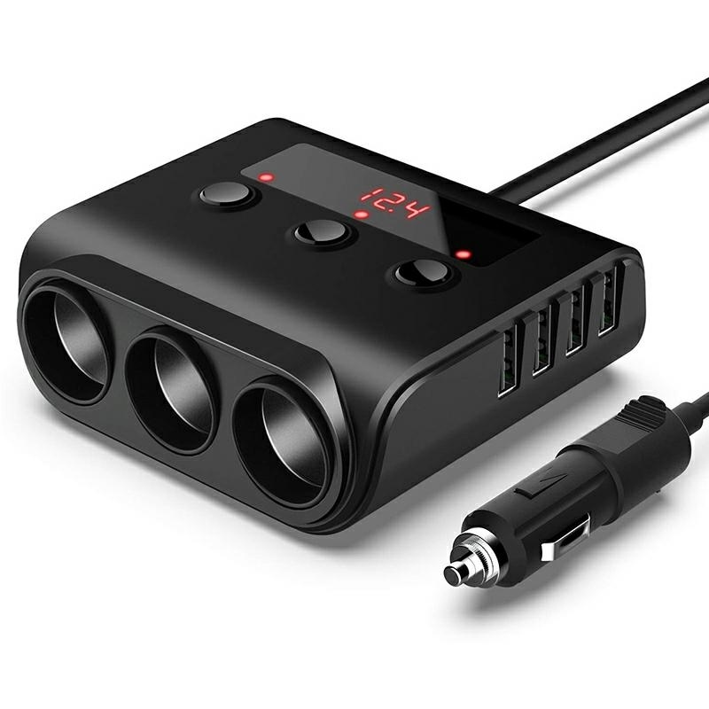 Expand your vehicle's charging capacity with this versatile 12/24V car cigarette lighter splitter. It transforms a single socket into three outlets and adds four powerful USB ports, ensuring all your devices stay charged on the go.