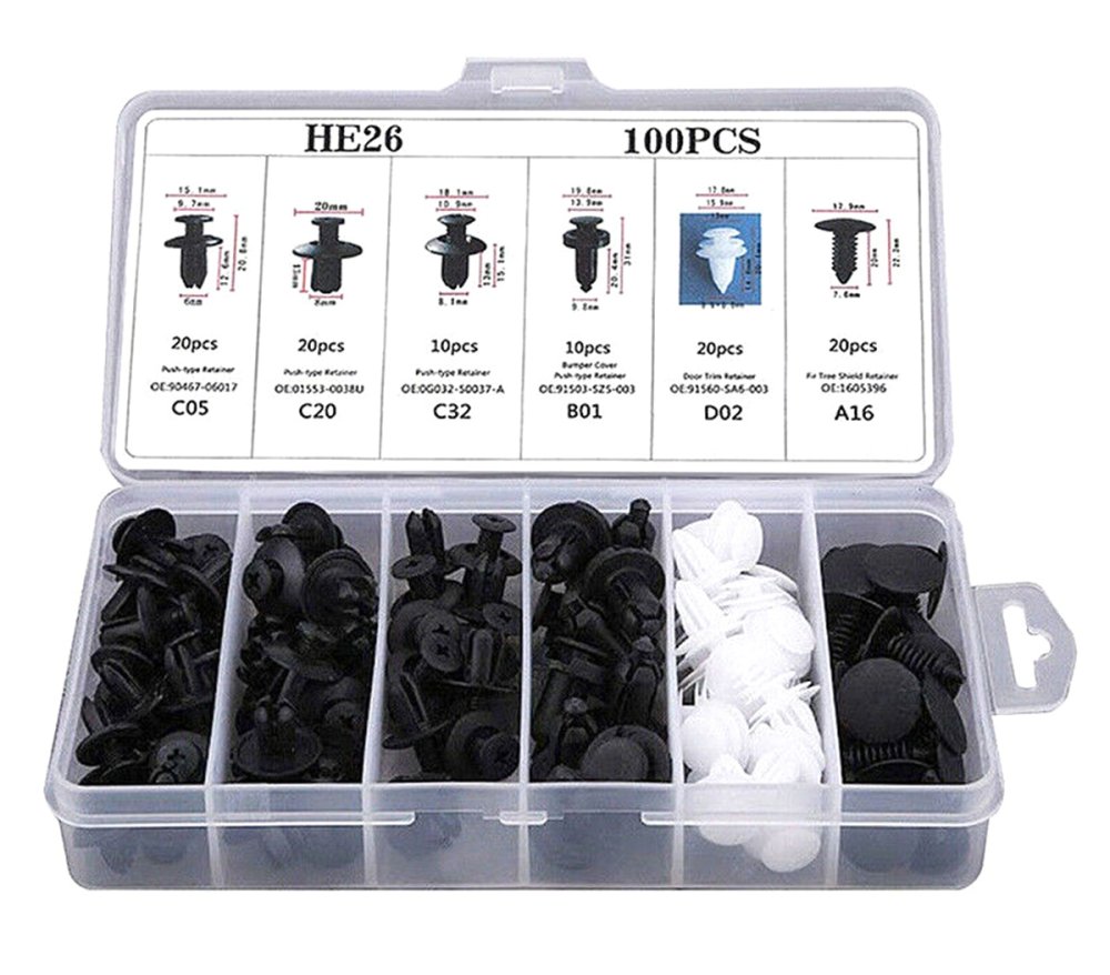 A universal set of 100 car clips and fasteners designed for securing various trim elements, panels, and automotive parts. This set is an essential addition to any garage or workshop, providing the most common fastener types in one place.