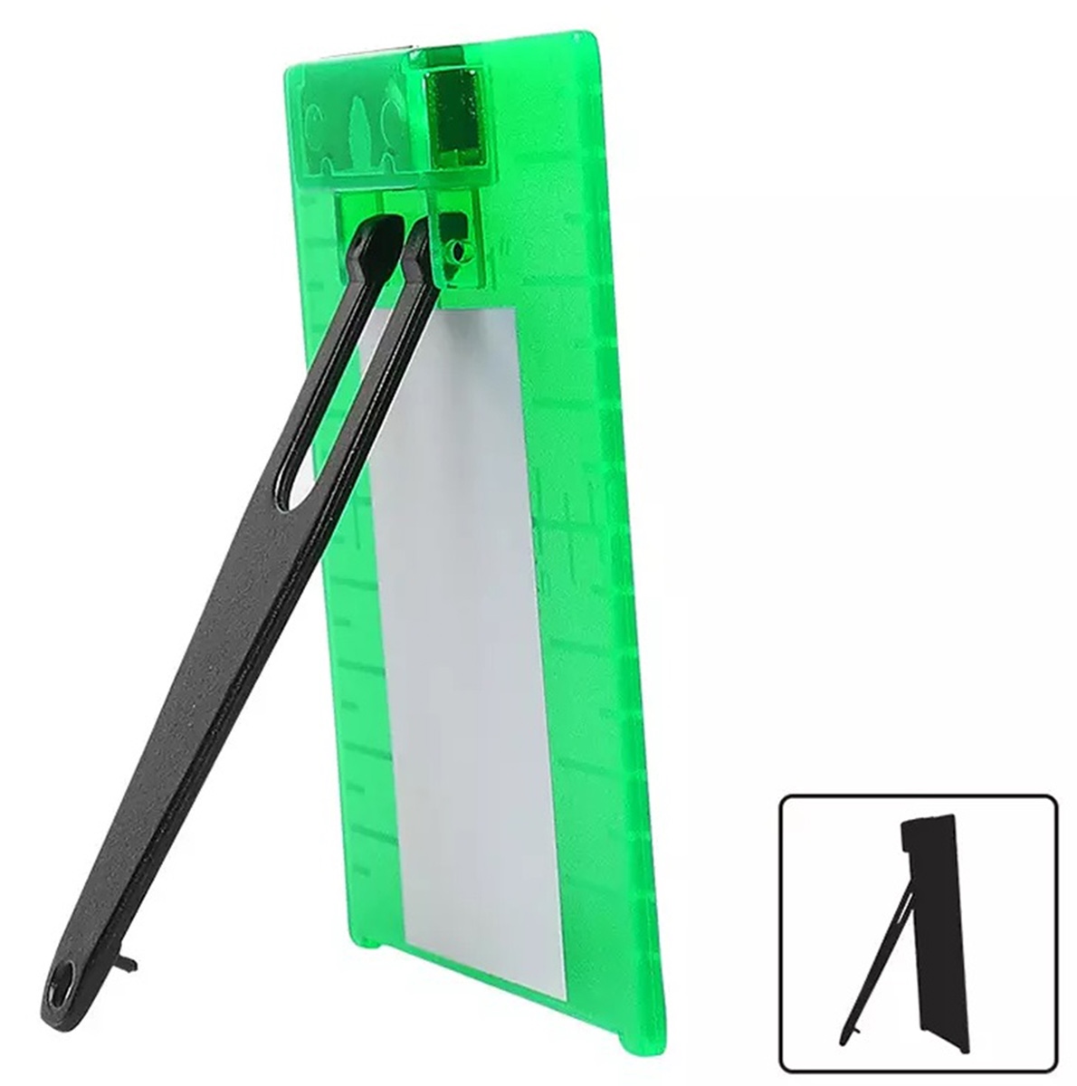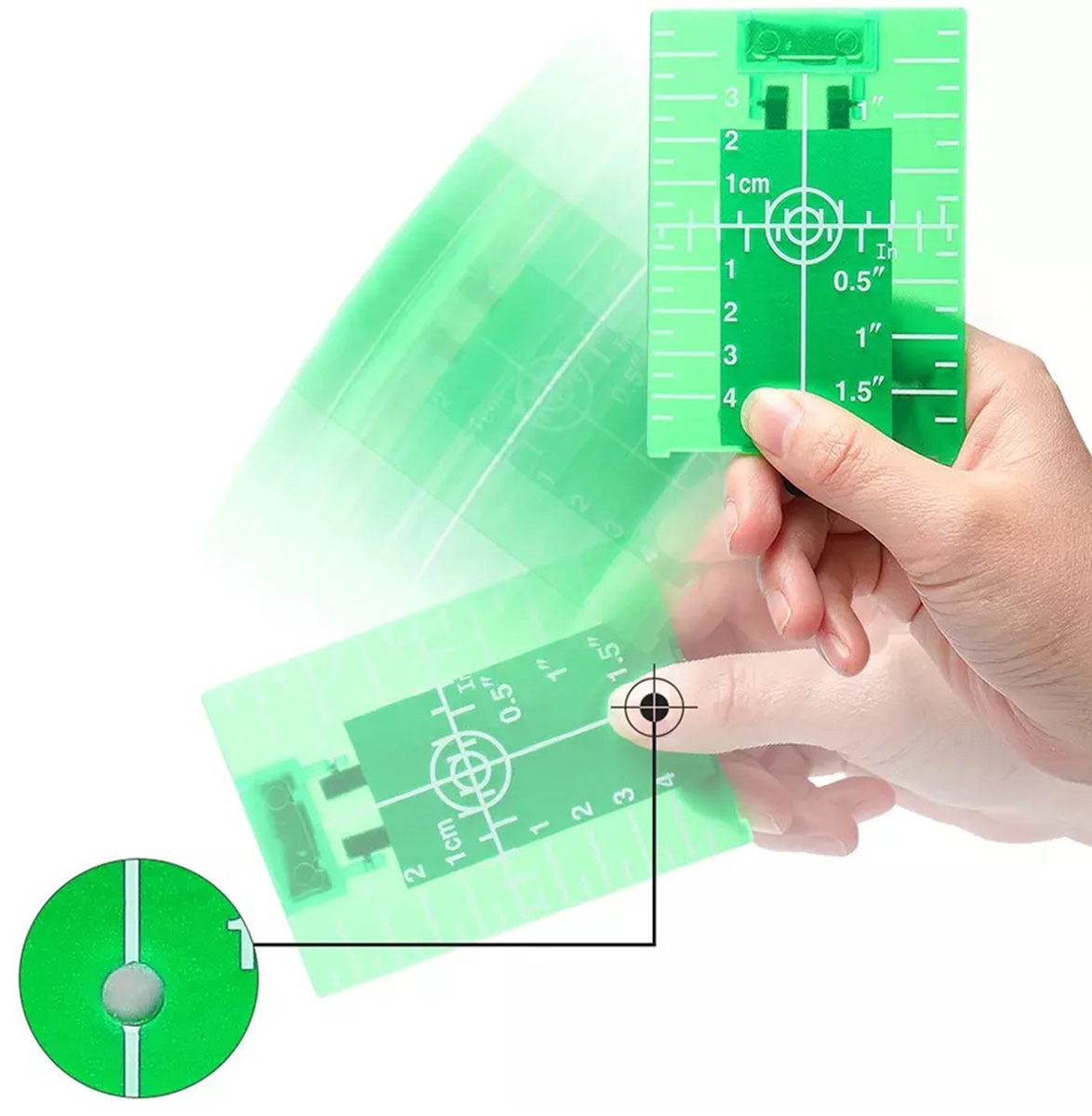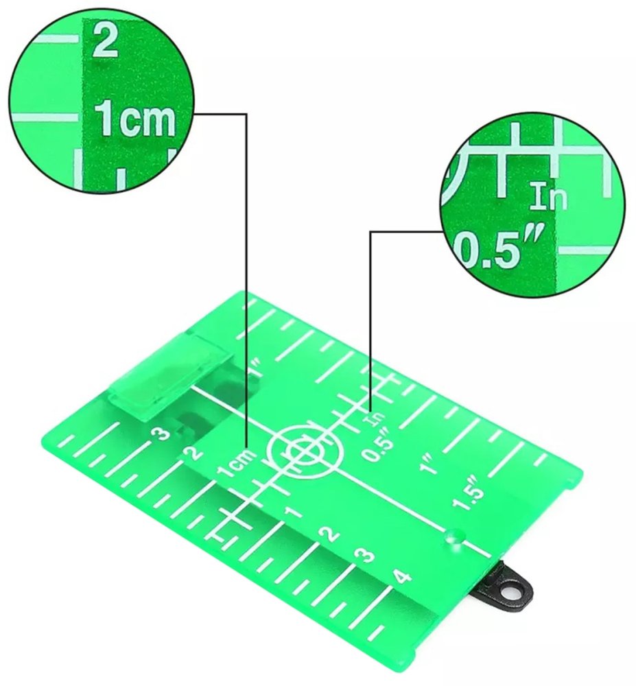 A target plate for a green crosshair laser. Significantly increases the visibility of laser beam which ensures correct reading when taking measurements. Equipped with centimeter and inch scale maximum precision. An additional strong magnet folding leg make it easy to hang dial or attach metal surface (such as profile).