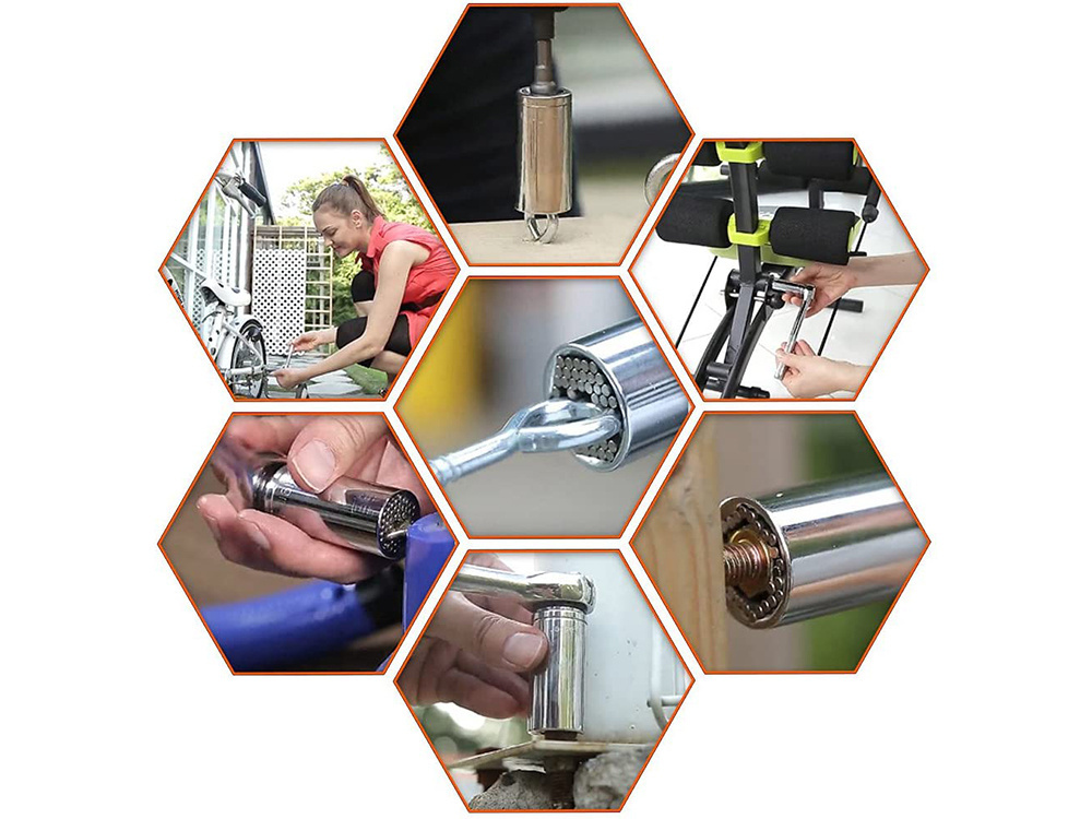 This universal socket is a versatile tool designed to replace an entire set of sockets. It instantly adjusts to grip hex nuts, square nuts, hooks, eye and lag screws, bolt heads, and more. It's the perfect solution for working with stripped, rusted, or broken fasteners, thanks to its unique design featuring hardened steel spring pins.