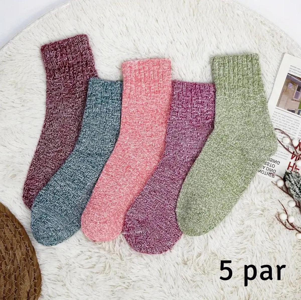 Set of 5 pairs of warm women's winter socks. Made from thick, breathable polyester knit that provides excellent protection against cold and keeps your feet comfortable all day. The high-cut design and snug elastic band prevent slipping and ensure a secure fit. The material allows your feet to breathe, reducing sweating and increasing comfort.