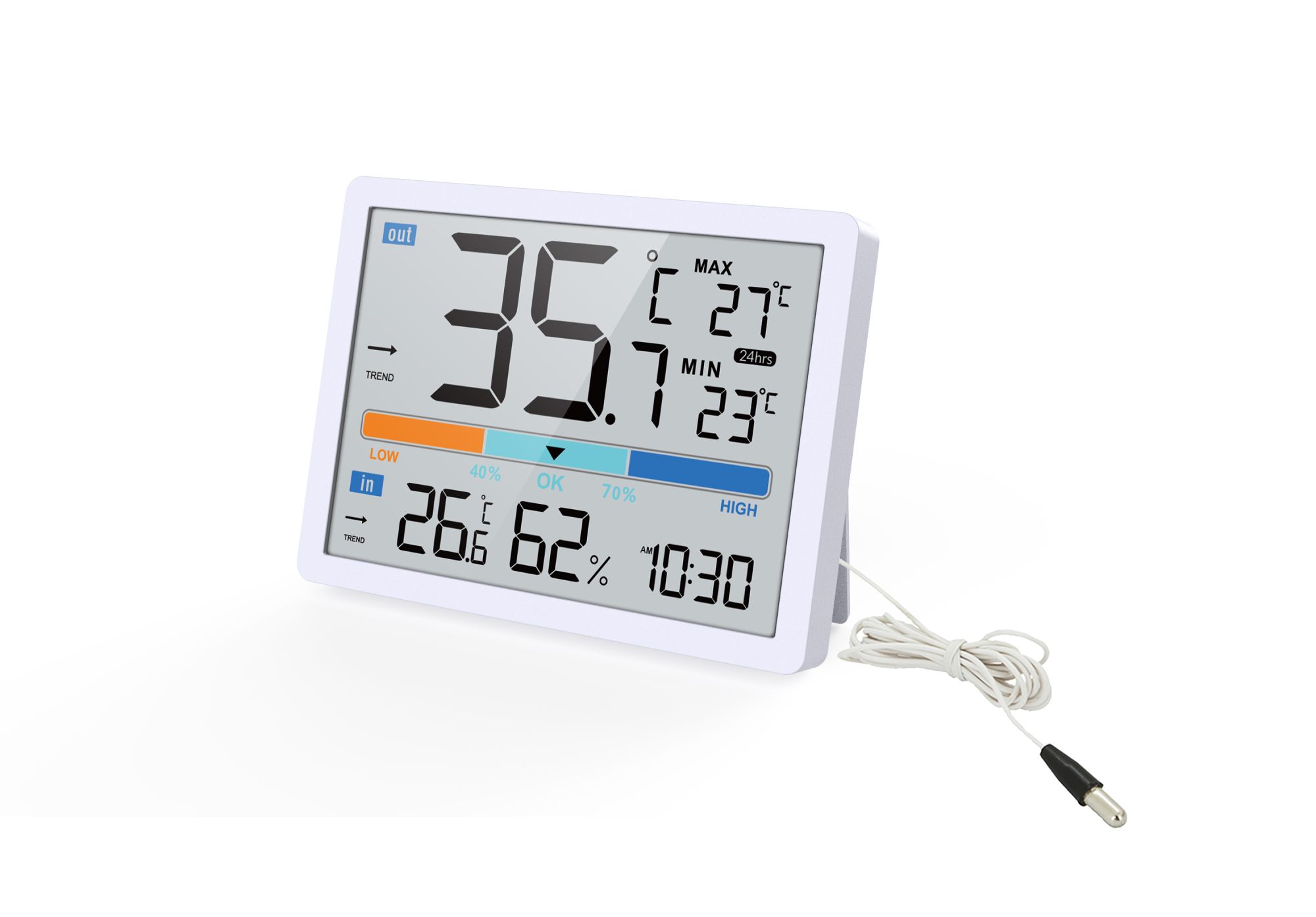 Featuring a large, easy-to-read LCD screen, this device displays current indoor and outdoor temperatures, indoor humidity, and the time. A handy comfort indicator lets you know if your indoor conditions are ideal, while the 24-hour memory function records the highest and lowest temperatures, so you can track changes over time. The reliable 5-foot (1.5m) wired probe ensures you get accurate outdoor readings without worrying about signal loss.