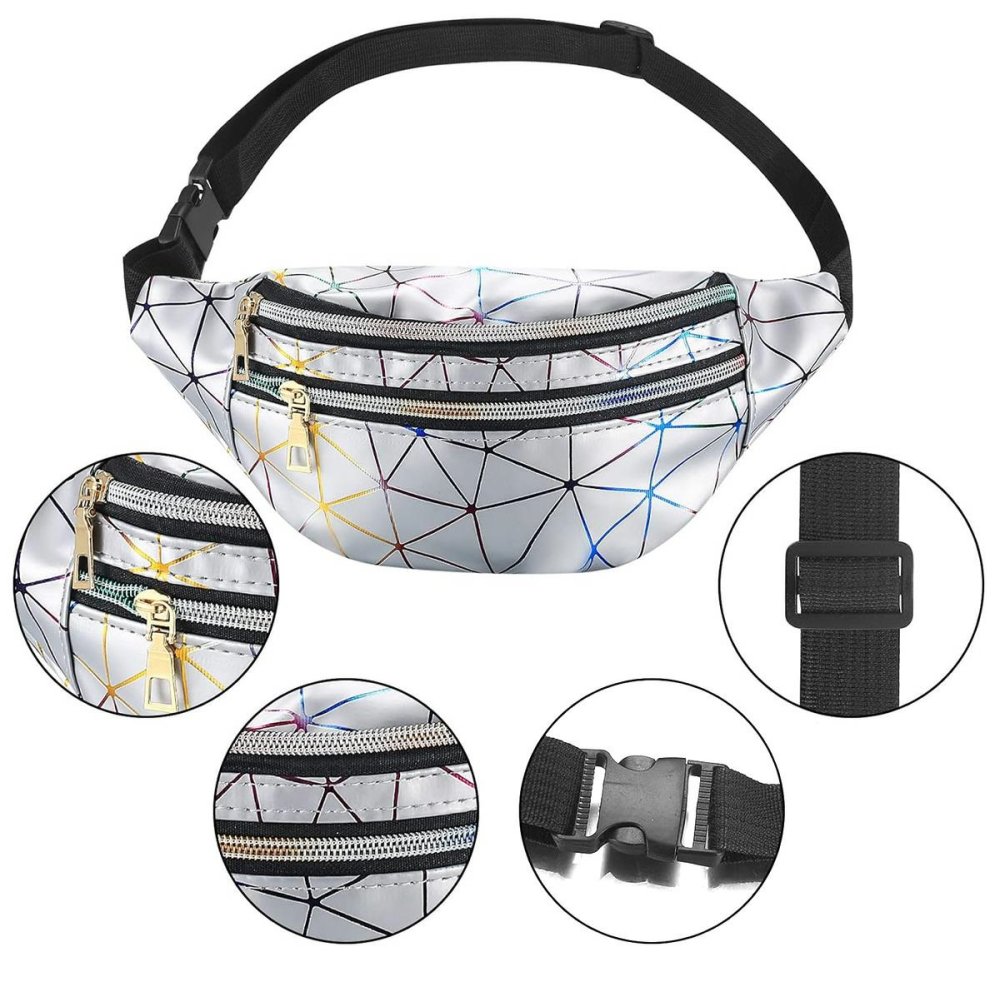 • Stilīgs dizains: Sudraba krāsa ar varavīksnes krāsas šuvēm piešķir somai modernu un pamanāmu izskatu.