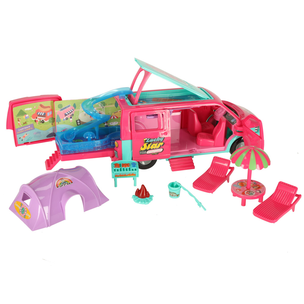 Pēc atvēršanas kemperis pārvēršas par krāsainu kempinga vietu ar atveramām durvīm, paceļamu jumtu, telti, baseinu un slidkalniņu. Tas veicina bērnu iztēli un ļauj veidot dažādas lomu spēļu situācijas.