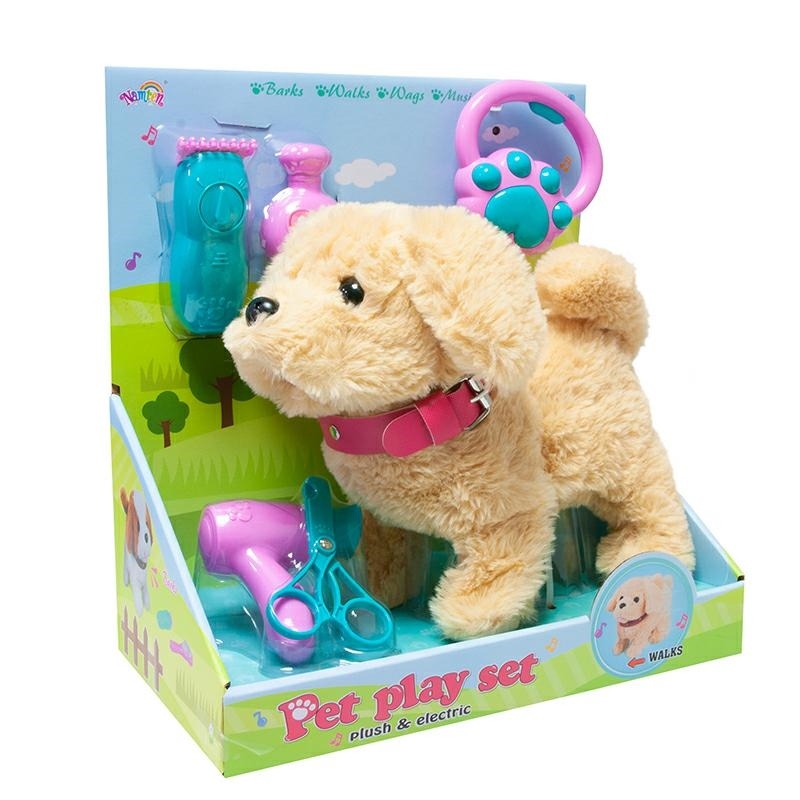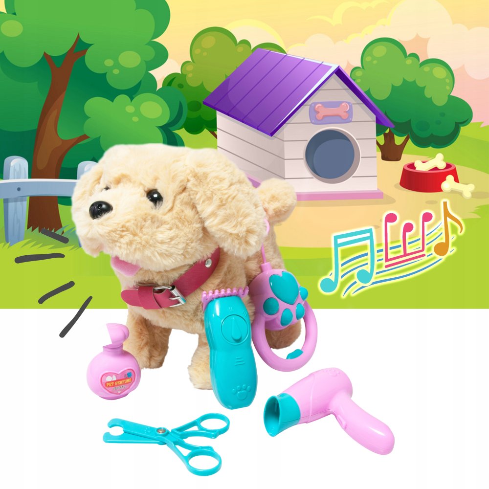 Собака обязательно порадует всех своим внешним видом и дружелюбными звуками. При включении - виляет хвостом, ходит, лает и играет веселые мелодии. В комплект также входят поводок для выгула собаки и аксессуары для ухода за питомцем.