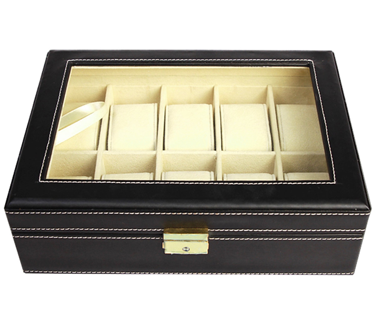 Чрезвычайно функциональный футляр / чехол для 10 наручных часов или браслетов. Практичный органайзер выполнен из элегантной эко-кожи черного цвета, прострочка серебряной нитью еще больше подчеркивает привлекательность футляра. Благодаря черному цвету он прекрасно впишется в интерьер любого декора.