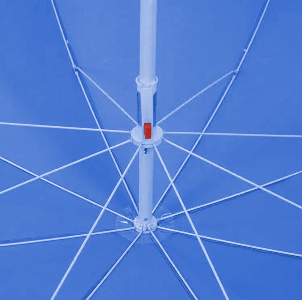 Stabils un viegls saulessargs ar lielu 160 cm diametru, izgatavots no izturīga materiāla, kas pasargā no mitruma un intensīvas saules. Augstums regulējams no 120 līdz 170 cm, ar iespēju saliekt rokturi, lai efektīvi aizsargātu no saules stariem un UV starojuma no jebkura virziena. Saulessargs lieliski piemērots pludmalei, dārzam, terasei vai balkonam, pateicoties vieglai konstrukcijai un kompaktam izmēram salocītā veidā (tikai 120 cm). To var uzstādīt gan zemē ar smailu galu, gan speciālā pamatnē (nav iekļauta komplektā). Saulessargs pasargā arī no viegla vēja un lietus. Krāsa: zila.